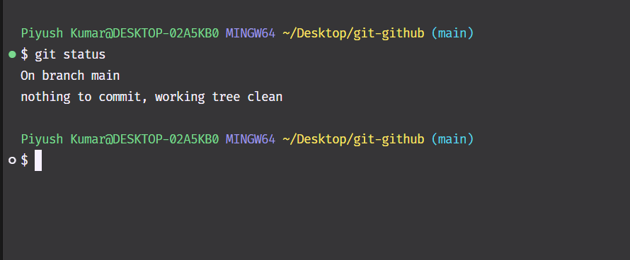 Git now shows that the working directory is clean, which means all changes have been successfully committed and there is nothing left to save at the moment. This confirms that the changes have moved from the staging area into the repository.